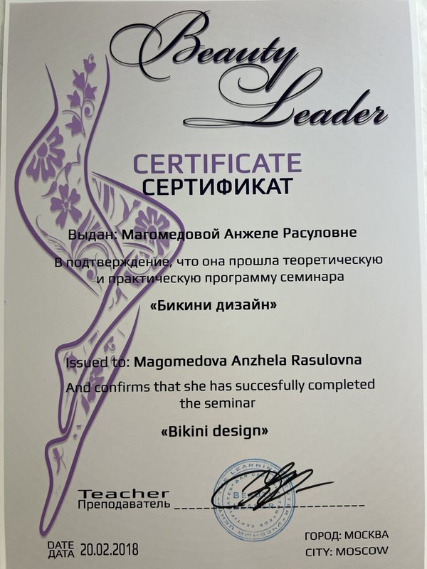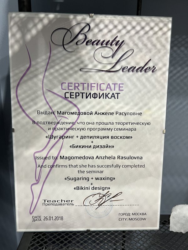 Мастер Анжела - профессионал своего дела, во время услуги было комфортно. Она все время дает рекомендации по уходу за кожей после эпиляции.